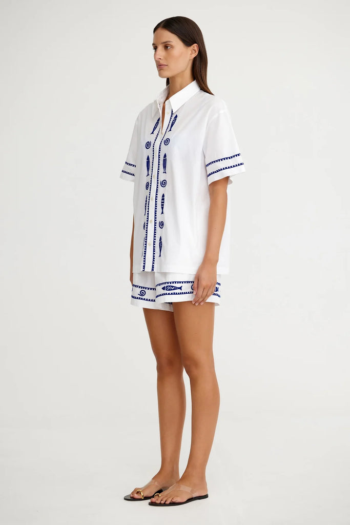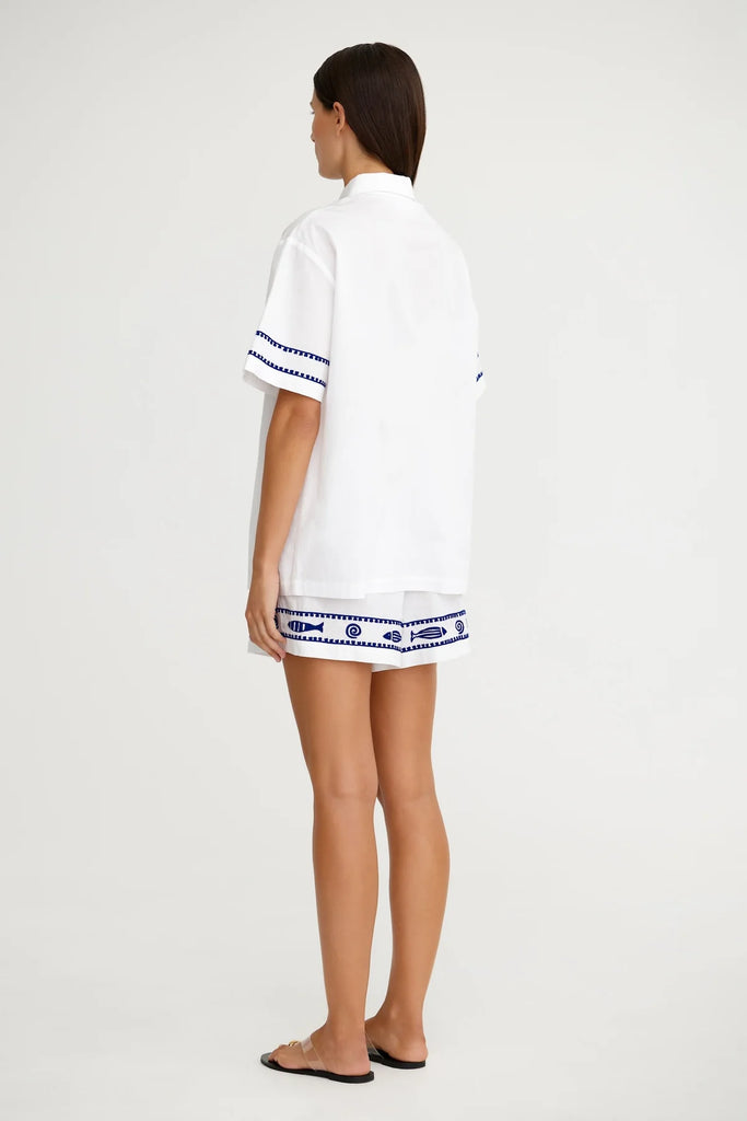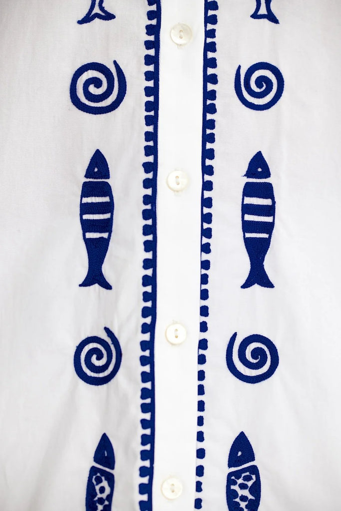 The Annette Shirt is an elevated essential perfect for brunch dates or weekend outings. Made from 100% cotton, this woven shirt features a front button closure with elegant shell buttons and intricate embroidered details on the front and cuffs, adding a touch of sophistication to a classic silhouette.