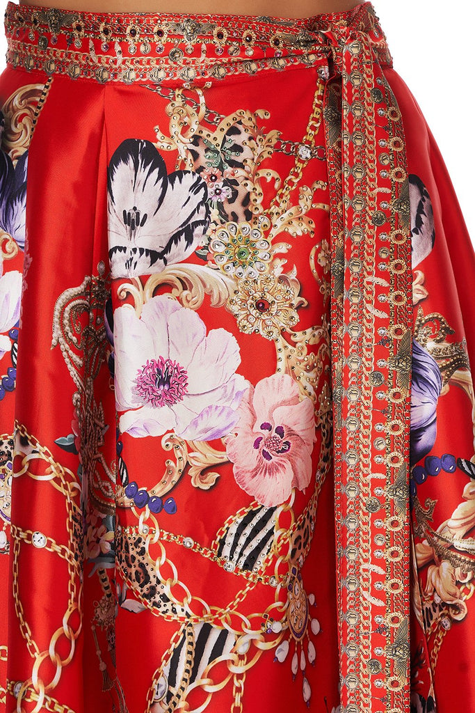 The talk of any party, our Prima Donna Maxi Wrap Skirt was born to turn heads in awe. Inspired by the luxury and opulence of the nineties and crafted with your next occasion in mind, special taffeta fabric brings volume and decadence. Rich in crimson, ornate gold chains and purple botanicals intertwine in matrimony while bold zebra print defines the hem. This statement maxi skirt plays host to a cinching wrap waist that is adorned in crystal, a classic A-line silhouette that falls to a voluminous flared hemline and pockets that greet the sides. Complete the set with the matching Bias Cami.