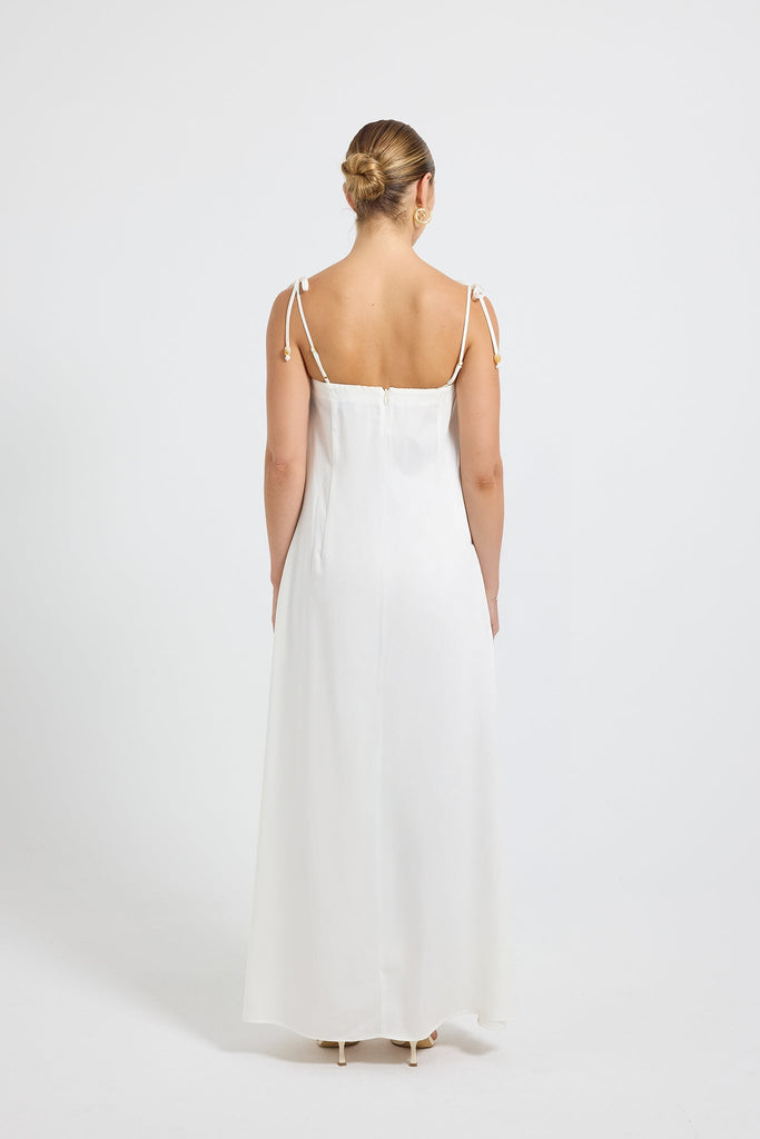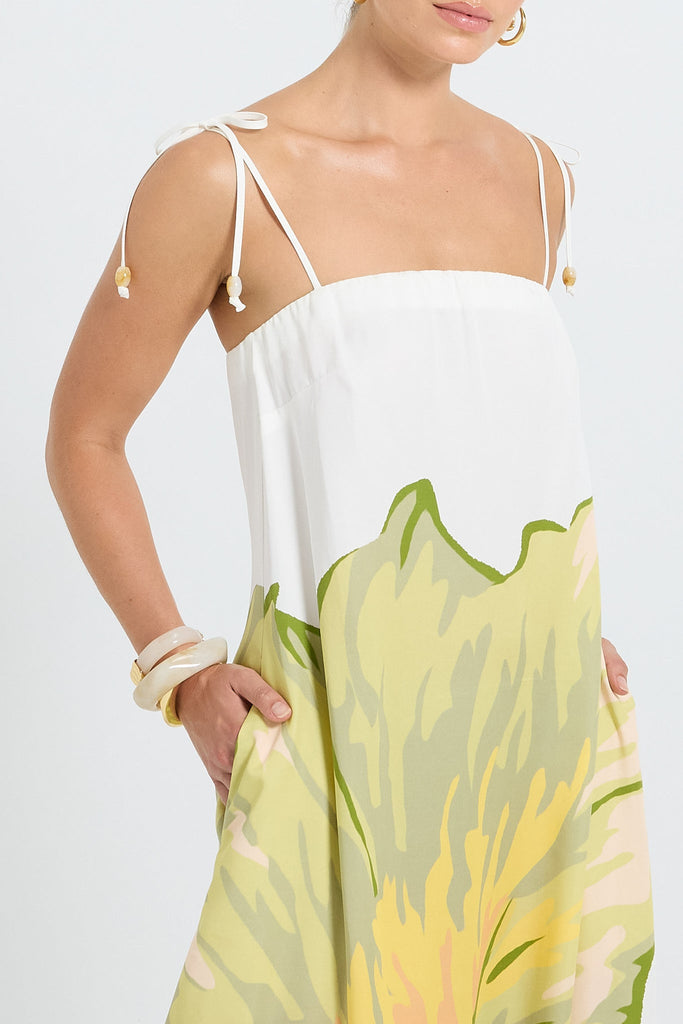 The Juno Maxi by PASDUCHAS is crafted from soft-touch Tencel and features an exclusive oversized palm print. It has a square-cut neckline with adjustable straps, flowing to a full maxi-length hem. The piece is secured at the back with elastic and an invisible zipper, ensuring comfort and ease of fit.