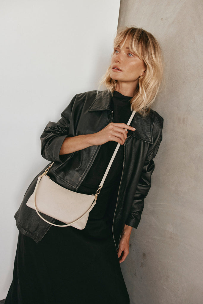 Compact yet surprisingly spacious, Ashley is designed to hold your daily essentials with ease: phone, sunglasses, keys and a small wallet, all secured by a sleek gold zip closure and an internal pocket for added organisation.